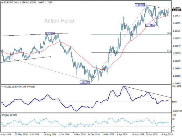 EUR/USD’s rise from 1.1390 resumed late last week by breaching 1.1741. The development aligns with the case that correction from 1.1829 has completed with three waves down to 1.1390. Initial bias is now on the upside this week for retesting 1.1829 first. Firm break there will resume larger up trend. For now, risk will stay on the upside as long as 1.1607 support holds, in case of retreat.