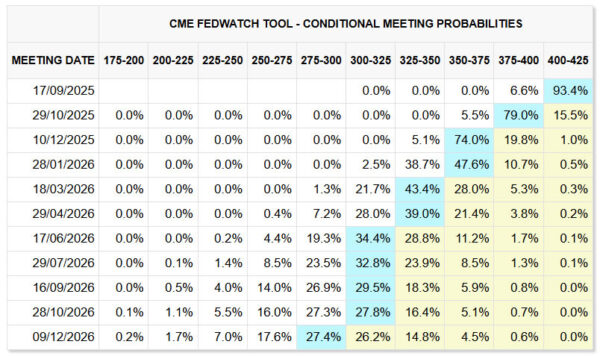 For the September 17 meeting, a 25bps rate cut is fully priced in. Markets now assign roughly an 85% probability to another move in October and an 80% chance of a December cut. If the Fed’s updated projections and Chair Jerome Powell’s remarks align with this path, equities could find further fuel for gains into year-end.
