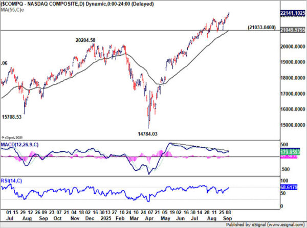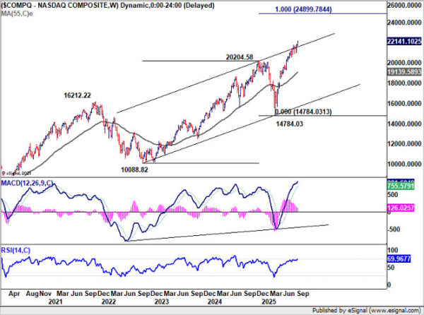 Technically, NASDAQ is attempting to move away from its long-term ascending channel. Sustained trading above the resistance could trigger a new wave of buying, and push NASAQ to 100% projection of 10088.82 to 20204.58 from 14784.03 at 24899.78, which is close to 25k psychological level.