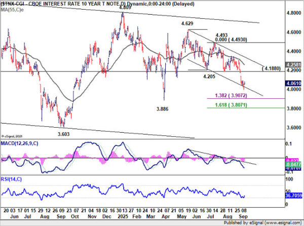 The next directional move hinges on how the Fed frames its easing cycle. A signal of faster cuts or a lower terminal rate would likely drive yields down further. Next target is 138.2% projection of 4.629 to 4.205 from 4.493 at 3.907, or even further at 161.8% projection at 3.807.