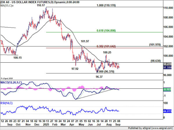Technically, as long as resistance at 98.63 caps rebounds, the near term bias for Dollar Index is for another test of 96.37 low. That level could hold on the first attempt and trigger a bounce.