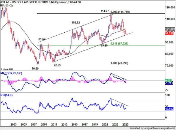 However, decisive break of 96.37 would firstly confirm resumption of whole down trend from 114.77. More importantly, sustained trading below the multi-decade channel floor at around 96 would have major bearish implications. It would open up deeper medium term down trend to 61.8% retracement of 70.69 (2008 low) to 114.77 (2022 high) at 87.52.