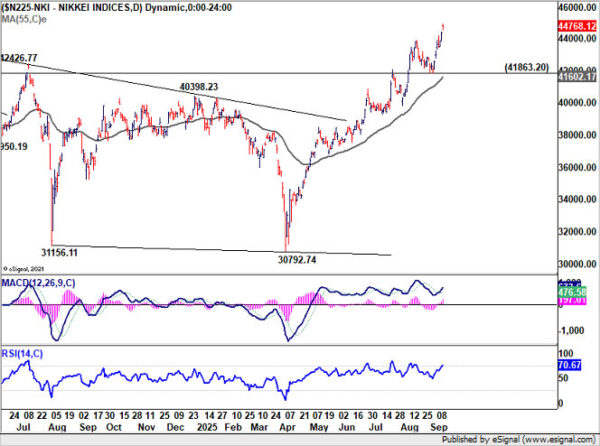 Technically, Nikkei remains on track to 100% projection of 25661.89 to 42426.77 from 30792.74 at 47557.62. Outlook will stay bullish as long as 41863.20 support holds, in case of retreat.