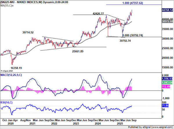 In Tokyo, Nikkei surged more than 4% for the week, marking yet another record. The rally was fueled by multiple factors: Tech and AI-linked shares tracking NASDAQ’s strength, optimism over Fed easing, and renewed political hopes at home. The emergence of former economic security minister Sanae Takaichi as a frontrunner for the LDP presidency injected a uniquely domestic bullish factor, as investors looked for a potential return to Abenomics-style policies favoring fiscal support and monetary accommodation.