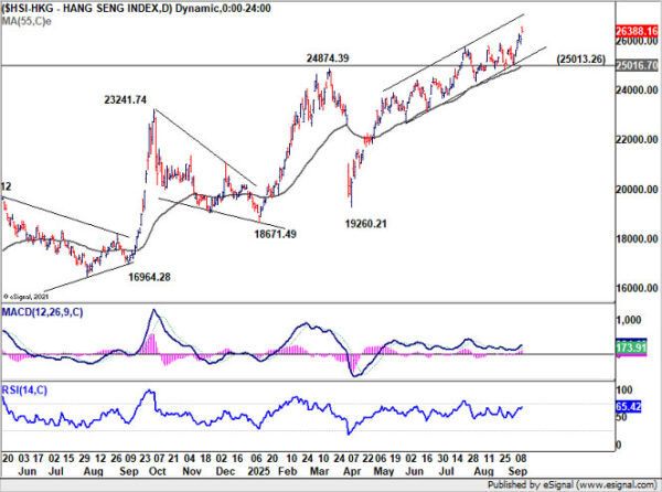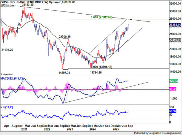 Technically, HSI is on track towards 161.8% projection of 14597.31 to 22700.85 from 14794.16 at 27905.69. For the near term, outlook will stay bullish as long as 25013.26 support holds, in case of retreat.