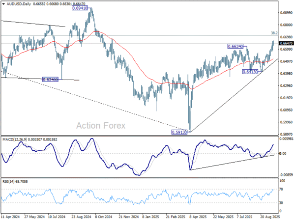 AUD/USD’s rise from 0.5913 resumed through 0.6624 resistance last week. There is no sign of topping yet, and initial bias stays on the upside. Next target is 0.6713 fibonacci level. Firm break there will carry larger bullish implications. On the downside, below 0.6589 minor support will turn bias neutral and bring consolidations first, before staging another rally.