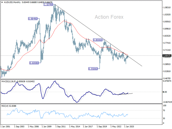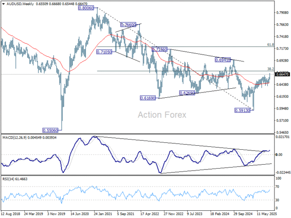 In the bigger picture, there is no clear sign that down trend from 0.8006 (2021 high) has completed. Rebound from 0.5913 is seen as a corrective move. While stronger rally cannot be ruled out, outlook will remain bearish as long as 38.2% retracement of 0.8006 to 0.5913 at 0.6713 holds. Nevertheless, considering bullish convergence condition in W MACD, sustained break of 0.6713 will be a strong sign of bullish trend reversal, and path the way to 0.6941 structural resistance for confirmation.