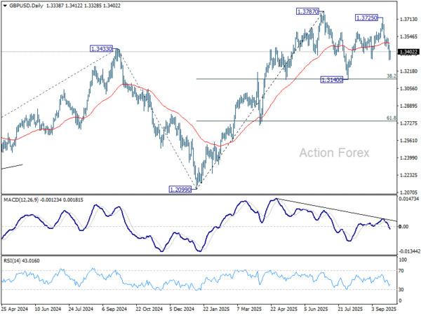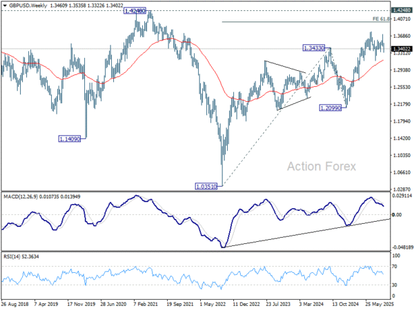 In the bigger picture, rise from 1.0351 (2022 low) is still seen as a corrective move. Further rally could be seen to 61.8% projection of 1.0351 to 1.3433 (2024 high) from 1.2099 (2025 low) at 1.4004. But strong resistance could be seen from 1.4248 (2021 high) to limit upside. Sustained break of 55 W EMA (now at 1.3155) will argue that a medium term top has already formed and bring deeper fall back to 1.2099.