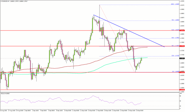 Looking at the 4-hour chart, the pair settled below the 1.1750 level, the 100 simple moving average (red, 4-hour), and the 200 simple moving average (green, 4-hour). A low was formed at 1.1645 and the pair is now attempting to recover.