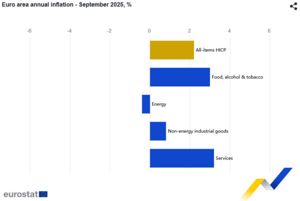 Eurozone headline inflation edged up in September, with CPI rising to 2.2% yoy from 2.0% yoy in August, in line with expectations. Core CPI, which excludes energy, food, alcohol and tobacco, held steady at 2.3% yoy, suggesting underlying price pressures remain sticky even as the energy drag eases.