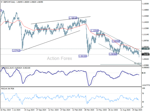 In GBP/CHF, the collapse through 1.0610/58 cemented the cross’s bearish structure, confirming resumption of the downtrend from 1.1675. As long as 1.0778 resistance caps recovery attempts, outlook remains firmly bearish. Next target is 100% projection of 1.1204 to 1.0658 from 1.0959 at 1.0413. Break beneath that could accelerate losses toward 1.0183, a level last seen during the 2022 risk-off wave.