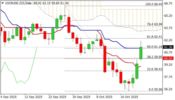 Bulls pressure immediate resistances at $62.26/41 (55DMA / Fibo 61.8%) guarding more significant base of daily Ichimoku cloud (spanned between $63.32 and $65.97), where bulls may face stronger headwinds and increased risk of recovery stall.