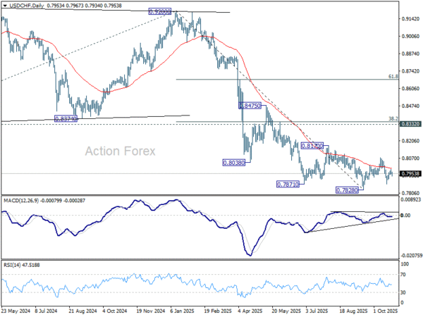 USD/CHF’s recovery from 0.7872 extended last week but retreated after hitting 0.7984 minor resistance. Initial bias remains neutral this week first and deeper decline is still in favor. On the downside, below 0.7913 will turn bias to the downside for 0.7872 support, and then 0.7828 low. However, firm break of 0.7984 will suggest that corrective pattern from 0.7828 is extending with another rising leg, and target 0.8075 again.