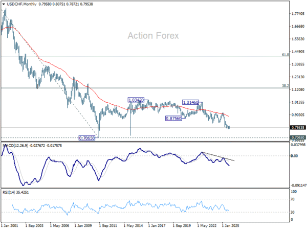 In the bigger picture, long term down trend from 1.0342 (2017 high) is still in progress. Next target is 100% projection of 1.0146 (2022 high) to 0.8332 from 0.9200 at 0.7382. In any case, outlook will stay bearish as long as 0.8332 support turned resistance holds (2023 low).