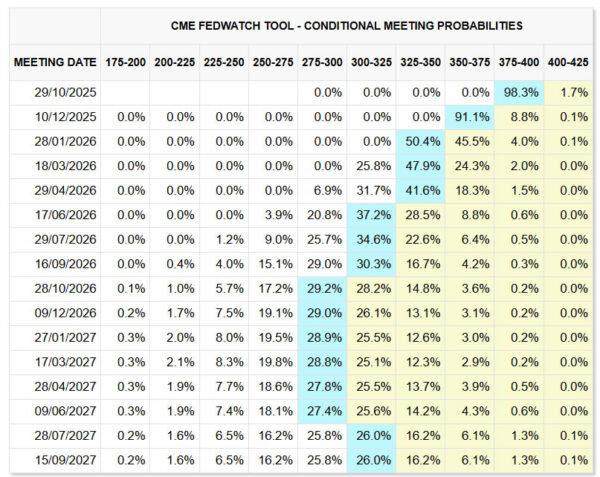 Fed fund futures now price in nearly a 100% probability of a 25bps rate cut at Wednesday’s FOMC meeting, which would bring the policy rate down to the 3.75–4.00% range. Expectations of another 25bps move in December have also solidified, with traders assigning more than 90% likelihood. The market now envisions the easing cycle extending into 2026, with three more cuts anticipated to lower rates toward 2.75–3.00% by late 2026 or early 2027.
