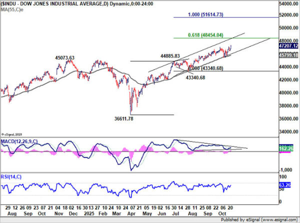 Technically, DOW remains comfortably within its near term ascending channel, and well supported by the rising 55 D EMA (now at 45,799). Friday’s decisive advance confirmed that the rally from 36,611 has resumed, targeting 61.8% projection of 36,611 to 44,885 from 43,340 at 48,454. The index could encounter some initial resistance near that level, which is close to the channel top. Even if short-term retreat occurs, outlook will stay as long as 55 D EMA holds firm.