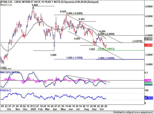 Further decline remains possible in the near term, but firm support zone near 61.8% projection of 4.493 to 3.992 from 4.200 at 3.891 should contain the downside on the first test. If yields hold above that level and break back above 4.05, that would signal short-term bottoming, paving the way for rebound toward 55 D EMA (now at 4.129).
