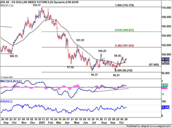 Meanwhile, Dollar Index rebounded after drawing support from 55 D EMA (now at 98.35), but upside momentum proved unconvincing. Dollar’s rally attempts were capped by by falling yields and broad risk-on sentiments.