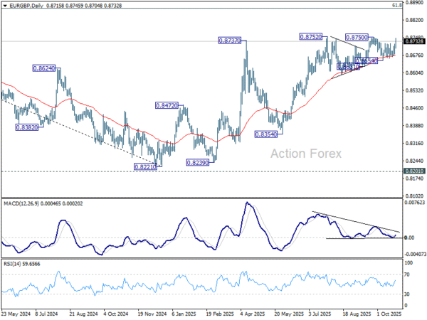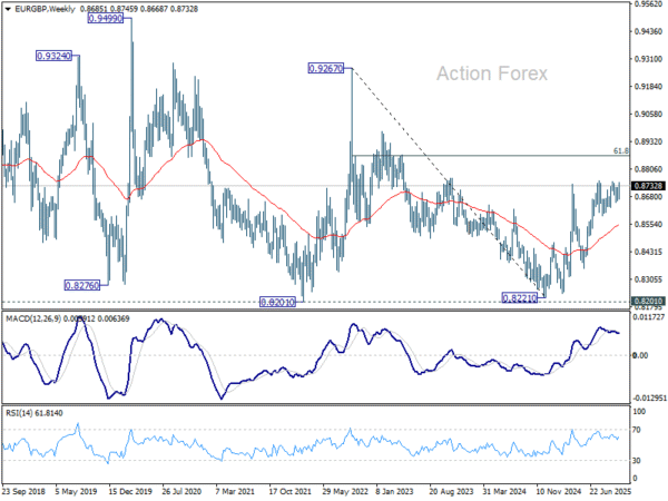 Technically, EUR/GBP was repeatedly supported by 55 D EMA (now at 0.8676). Pullback from 0.8750 may have already run its course. Firm break above 0.8750 would signal resumption of the rise from 0.8221, with the next target 61.8% retracement of 0.9267 to 0.8221 at 0.8867.