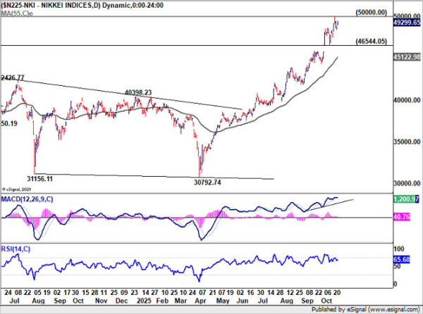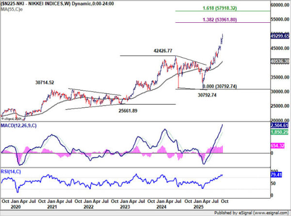 Technically, near term outlook will stay bullish as long as 46,544.05 support holds. Sustained trading above 50,000 will extend the up trend to 138.2% projection of 25,661.89 to 42,426.77 from 30,792.74 at 43,961.80 in the medium term.