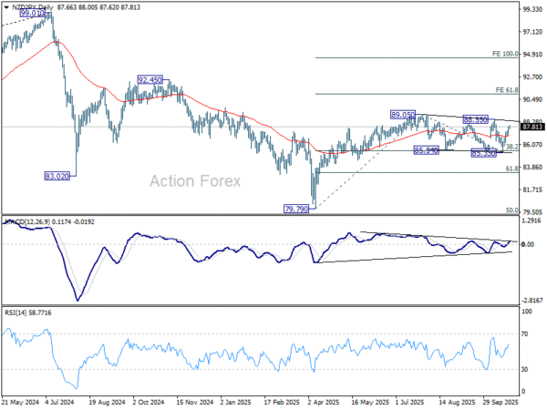 Meanwhile, Yen continues to underperform, with NZD/JPY ended as the top mover, registering 1.89% gain. Technically, for NZD/JPY, repeated support from 38.2% retracement of 79.79 to 89.05 at 85.51 keeps the rise from 79.79 intact. Indeed, it’s possible that the corrective pattern from 89.05 has already completed with three waves to 85.33.