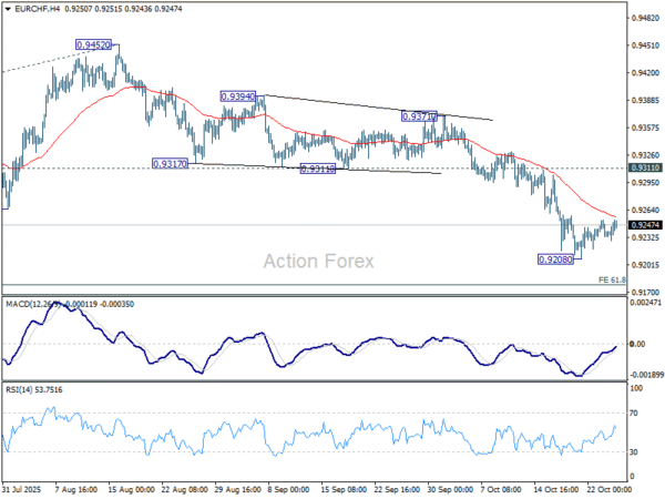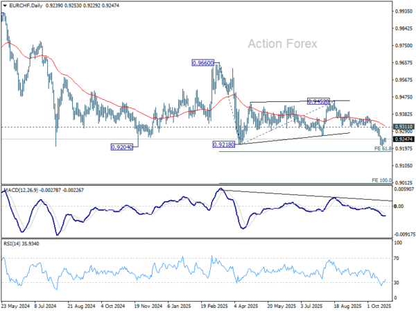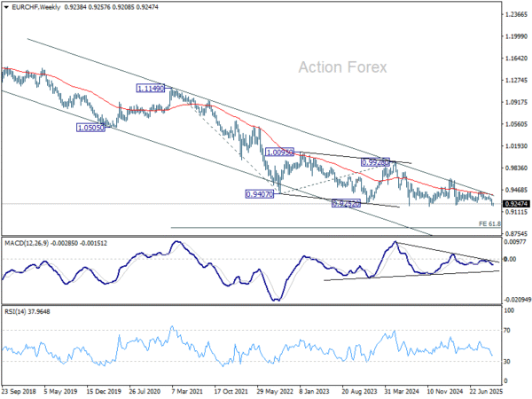In the bigger picture, outlook remains bearish with EUR/CHF staying well inside long term falling channel after multiple rejection by 55 W EMA (now at 0.9395). Firm break of 0.9204 will resume the whole down trend from 1.2004 (2018 high). Next target is 61.8% projection of 1.1149 to 0.9407 from 0.9928 at 0.8851. Break of 0.9452 resistance is needed to be the first sign of medium term bottoming.