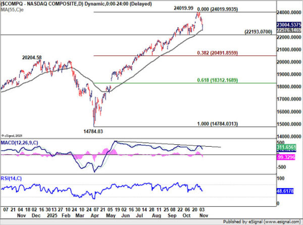 Conversely, decisive fall below 22,193.07 support would signal that the consolidation is maturing into a deeper correction, targeting the 38.2% retracement of 14,784.03 to 24,019.99 at 20,491.85.