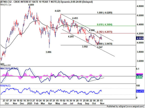 That dynamic was already visible last week as the U.S. 10-year yield climbed back above 4.1, touching an intraday high of 4.161 before retreating. Technically, the rebound from the 3.947 short term bottom still looks corrective within the broader downtrend from 4.629. Upside should be capped by 4.205 cluster resistance (38.2% retracement of 4.629 to 3.947 at 4.207). That should set the range for more sideway trading between 3.95/4.20 in the near term.