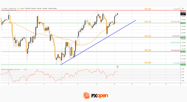 On the hourly chart of USD/JPY at FXOpen, the pair started a decent increase from 152.80. The US Dollar gained bullish momentum above 153.20 against the Japanese Yen.