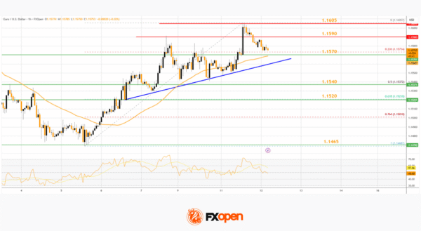 - There is a key bullish trend line forming with support near 1.1570 on the hourly chart of EUR/USD at FXOpen.