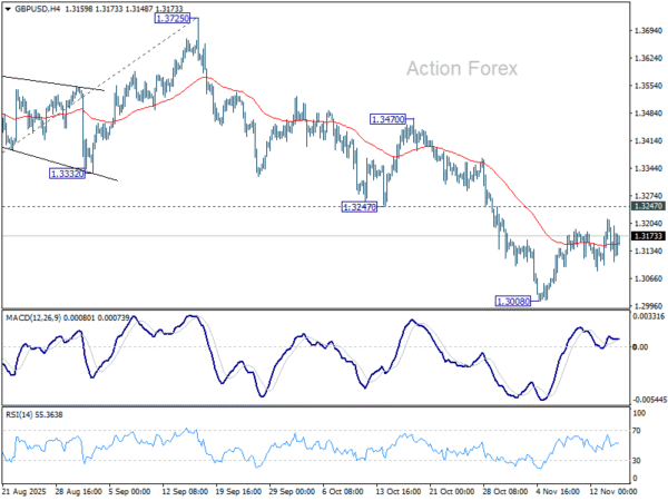 GBP/USD stayed in consolidations above 1.3008 last week and outlook is unchanged. Further decline is expected as long as 1.3247 support turned resistance holds. Break of 1.3008 will resume the fall from 1.3787, and target 138.2% projection of 1.3787 to 1.3140 from 1.3725 at 1.2831). Nevertheless, firm break of 1.3247 will suggest that fall from 1.3787 has completed as a corrective move already.