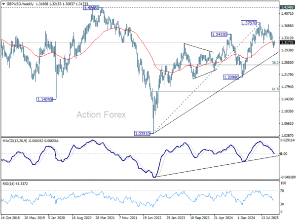 In the bigger picture, the break of 55 W EMA (now at 1.3185) is taken as the first sign that corrective rise from 1.0351 (2022 low) has completed. Decisive break of trend line support (now at 1.2824) will solidify this case and target 38.2% retracement of 1.0351 to 1.3787 at 1.2474 next. Meanwhile, in case of another rise, strong resistance should emerge below 1.4248 (2021 high) to cap upside to preserve the long term down trend.