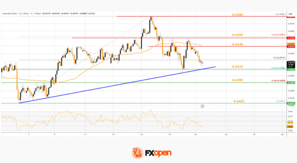 - There is a key bullish trend line forming with support at 0.6510 on the hourly chart of AUD/USD at FXOpen.