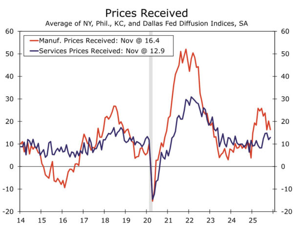 Fresh data on inflation since the FOMC last met have been more limited. The Committee will receive the September PCE price index prior to its upcoming meeting. The PPI and CPI data for that month point to the Fed’s preferred measure of inflation rising 2.8% in the 12 months through September on both a headline and core basis, largely unchanged from the readings seen over the summer. While still frustratingly above target, there are few signs of inflationary pressures bubbling up further, in our view. Average hourly earnings growth is generally consistent with 2% inflation, while the September PPI showed the pickup in inflation this year remains limited to the goods sector. Inflation expectations generally remain well-anchored, and businesses also appear to be raising prices a bit more slowly over the past month or so. Fewer firms in the NFIB survey have been reporting higher prices, while the latest regional Fed PMIs show prices received moderating (Figure 2).