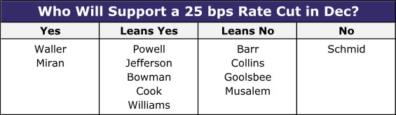 With inflation continuing to run above target and the FOMC having already cut 50 bps since the summer, the Committee has grown increasingly split on its next course of action. The public comments from FOMC officials in recent weeks reflect this unusually deep divide. Governors Miran and Waller have explicitly stated their support for rate cuts at the December meeting. Governors Jefferson, Bowman and Cook have not been quite as explicit in their support, but their public remarks in recent months lead us to believe they also will support another 25 bps rate cut in December. If there is a hawk lurking on the Board, it is probably Governor Barr. Governor Barr expressed some concern that “we’re seeing inflation still at around 3% and our target is 2%” in comments on November 20.