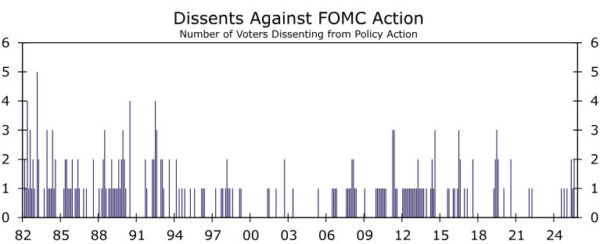 We believe that, on net, there will be a critical mass of support for a 25 bps rate cut in December, particularly among the FOMC’s leadership (Figure 3). That said, there is clearly disagreement within the ranks. Should the Committee cut rates like we expect, we can easily envision three or four votes against the action, with dissents once again possible in both directions of the policy decision. Governor Miran in particular could dissent in favor of a 50 bps cut if his vote is not needed to lock in 25 bps. The last time there were three dissents was September 2019, while four dissents last occurred in October 1992 (Figure 4).