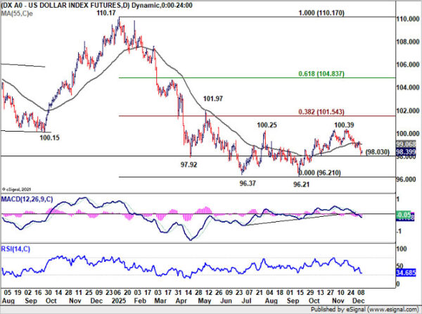 Meanwhile, Dollar Index extended the fall from 100.39 last week and immediate focus is now on 98.03 support. As noted many times before, rebound from 96.21 is seen as a corrective move. Firm break of 98.03 will argue that this corrective rise has completed after rejection by 55 W EMA (now at 100.44). That should bring deeper fall back to retest 96.21 low. In this case, there is also risk of immediate resumption of the whole down trend from 110.17.