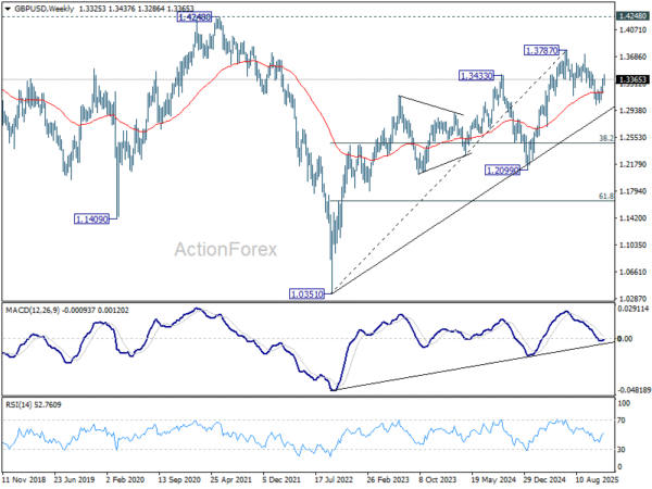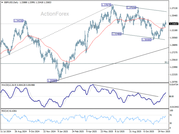 GBP/USD’s rally from 1.3008 extended to 1.3438 last week but retreated from there. Initial bias remains neutral this week first. Further rally is expected as long as 1.3286 support holds. As noted before, fall from 1.3787 should have completed as a three-wave correction to 1.3008. Above 1.3428 and firm break of 1.3470 resistance will pave the way back to retest 1.3787 high. However, sustained break of 1.3286 support will mix up the near term outlook.