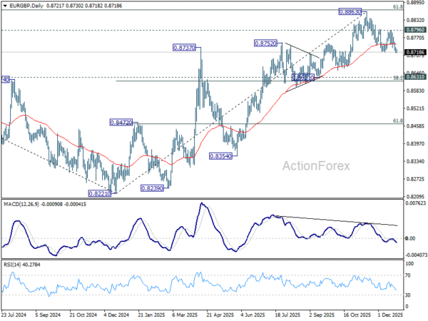 In the bigger picture, rise from 0.8221 medium term bottom is still seen as a corrective move. Upside should be limited by 61.8% retracement of 0.9267 to 0.8221 at 0.8867. Sustained trading below 55 W EMA (now at 0.8610) should confirm that this corrective bounce has completed. However, decisive break of 0.8867 will suggest that EUR/GBP is already reversing whole decline from 0.9267 (2022 high). That should pave the way back to 0.9267.