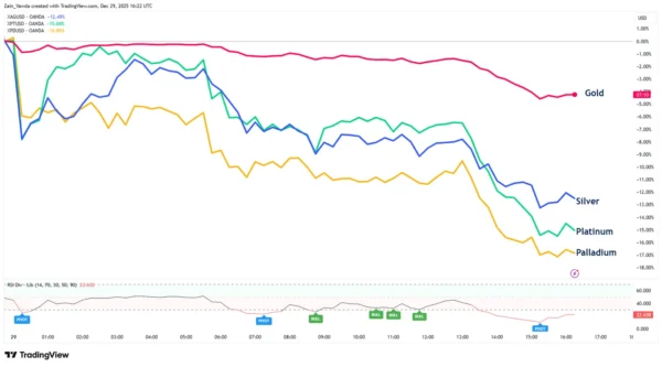 Precious metals and commodities are falling across the board as profit taking and portfolio rebalancing ahead of the new year appear to be driving some volatility following the recent price surge ahead of Christmas day.