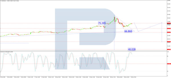 On the H4 chart, XAG/USD completed an impulsive wave up to 83.70 USD. The market is now developing a corrective decline toward 66.80 USD. Upon reaching this level, a subsequent upward wave toward 75.30 USD may materialise.
