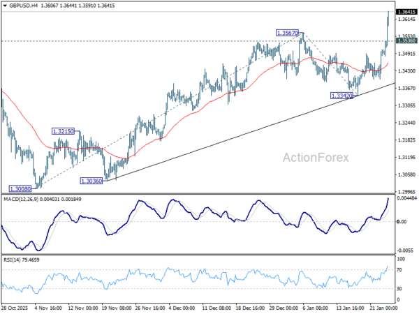 GBP/JPY’s rise from 1.3008 resumed last week by breaking through 1.3567 short term top decisively. Initial bias stays on the upside this week for retesting 1.3787 high. Firm break there will confirm larger up trend resumption. On the downside, below 1.3536 minor support will turn intraday bias neutral. But retreat should be contained well above 1.3342 support to bring another rally.