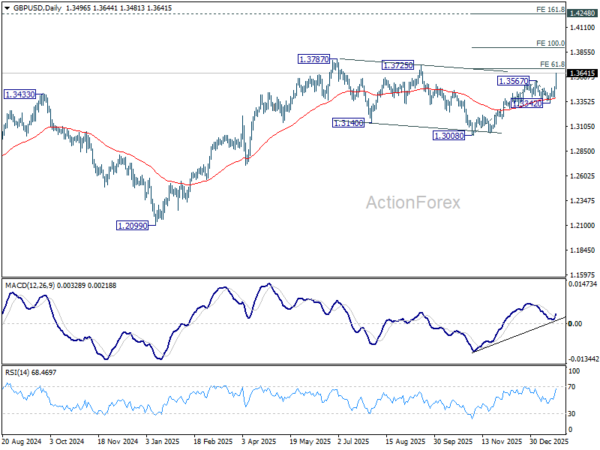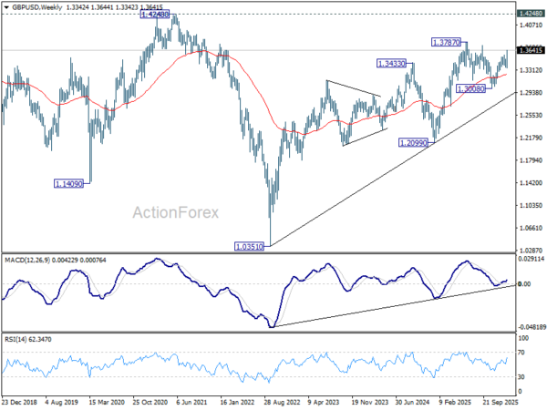In the bigger picture, price actions from 1.3787 (2025 high) are seen as a correction to the larger up trend from 1.3051 (2022 low). That might have completed at 1.3008 already. Firm break of 1.3787 will confirm up trend resumption. Next target is 1.4284 key resistance (2021 high). This will remain the favored case as long as 1.3008 support holds.