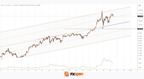 Given the above, it is reasonable to assume that after silver surpassed the psychological level of $100 per ounce, demand took on a frenzy-like character. Meanwhile, “smart money” is using the broad market to take profits on long positions after a staggering rise (more than +200% over the past six months). In other words, this points to a distribution phase in terms of Richard Wyckoff’s method.