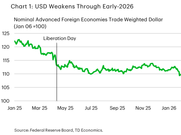 It was a busy week of updates on the Canadian economy, on top of an announcement of expanded support for modest income Canadians and a widely expected rate hold from the Bank of Canada. Yet, after all the news, Canadian bond yields are roughly in line with last Friday’s close. Currency markets made headlines this week (see commentary) with the U.S. dollar’s (USD) slide since mid-January – lifting the CAD roughly 2.7% against USD over that span. Overall, the economy is still tracking with our prior forecasts, with relatively weak growth expected in 2026.