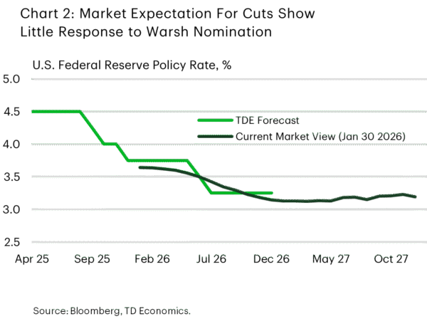 Importantly, Fed futures barely budged following President Trump’s announcement that he is nominating Warsh to be the new Fed chair – with two cuts still priced by year-end (Chart 2). For the time being, concerns surrounding Fed independence have been tempered. But rest assured – if confirmed by the Senate – market participants will parse every word over the coming months as Warsh shadows Chair Powell.