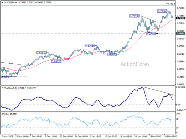 Intraday bias in AUD/USD is turned neutral first with current retreat, and some consolidations would be seen. But downside should be contained above 0.6896 support to bring another rally. On the upside, above 0.7146 will resume larger up trend to 100% projection of 0.5913 to 0.6706 from 0.6420 at 0.7213. However, considering bearish divergence condition in D MACD, firm break of 0.6896 will argue that deeper correction is underway to 55 D EMA (now at 0.6802).