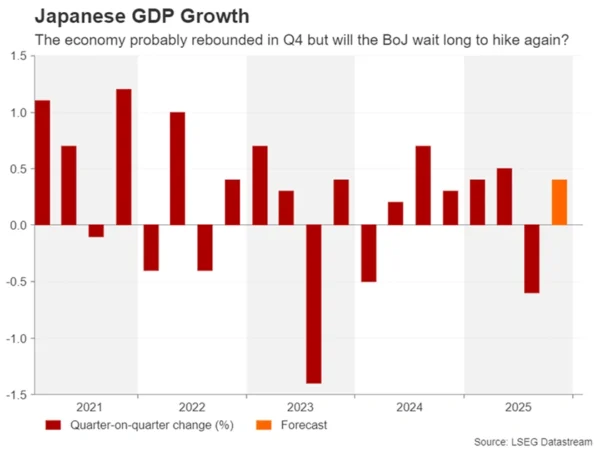 The yen’s rally has started to broaden against other majors and could gain further traction on Monday if the Q4 GDP estimate impresses. Japan’s economy is forecast to have grown by 0.4% q/q, recovering partially from the 0.6% contraction in Q3.