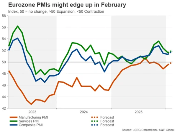 In the euro area, the flash February PMIs are the main focal point for the single currency. Although the euro’s recent surge against the dollar has cooled, a revisit of the $1.20 territory remains on the cards as long as the Eurozone economy maintains its moderate but steady pace of growth and Fed rate cut bets aren’t scaled back beyond 50 bps.