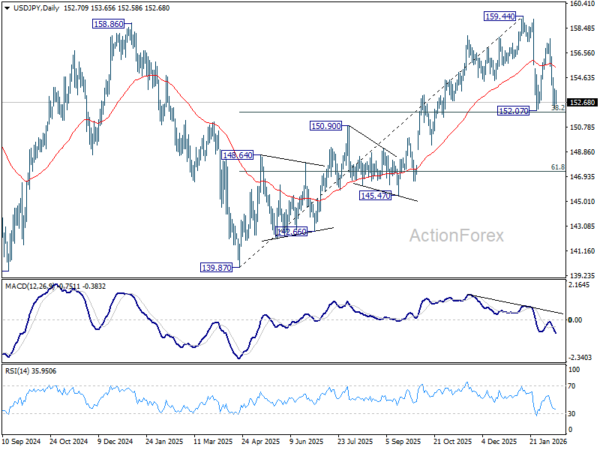 USD/JPY fell sharply last week but the decline lost momentum ahead of 152.07 support. Intial bias stays neutral this week first. With 38.2% retracement of 139.87 to 159.44 at 151.96 intact, price actions from 159.44 are seen as a consolidations pattern only. On the upside, sustained break of 55 4H EMA (now at 154.51) will bring stronger rebound towards 157.65. However, decisive break of 151.96 will argue that it’s reversing the rise from 139.87 already. In this case, deeper fall should then be seen to 61.8% retracement at 147.34, and possibly below.